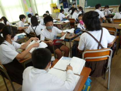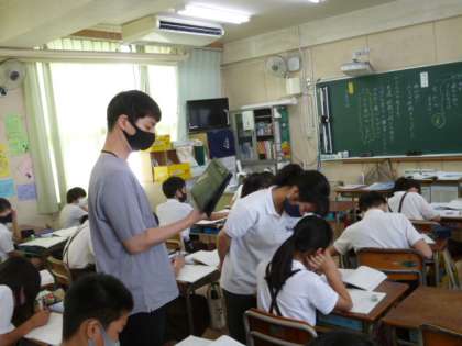3枚目の写真は、授業の流れをリモートで教育センターの学力向上推進指導員の先生に参観していただいている様子です。授業後には、Teamsで指導講評をしていただいています。緊急事態宣言中で直接参観していただけない状況ですが、ICT機器の強みを学力向上の取組にも生かしています。