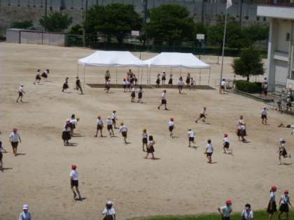 熱中症対策のひとつとして、大運動場と小運動場の間に、テントを立てました。体育の授業中や休み時間など、ときどき日陰に入って、休息したり水分補給をしたりしています。