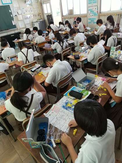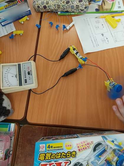 理科の実験をするために、色々な準備をしました。実験キットの中に入っている部品を切ったり、組み合わせたりしました。その後、簡易検流計の使い方を学習しました。簡易検流計が動く様子や電流が流れてることを確認するためのプロペラが回ったのを見て、とても嬉しそうにしていました。
