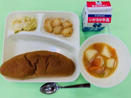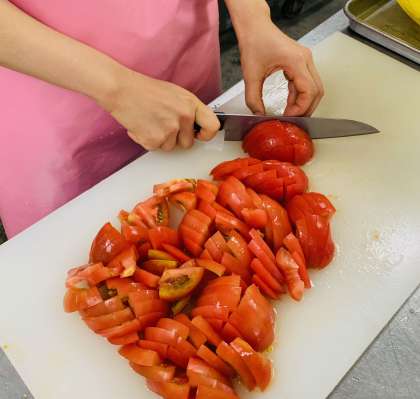スープ煮は、今が旬の生のトマトを使用しています。今日は、福井県から届いたトマトを、調理員さんが一つひとついちょう切りにして、スープ煮に入れています。(写真参照)