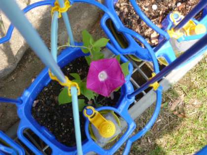 ↓ 1年生が育てているアサガオ。初めの一輪が咲きました。