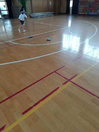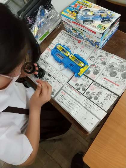今日は理科の電気のはたらきの学習で使っていたモーターカーを組み立てて走らせました。動いている様子を見て、「やった!走った。」「プロペラつけて走ったで。」など、楽しそうにしていました。