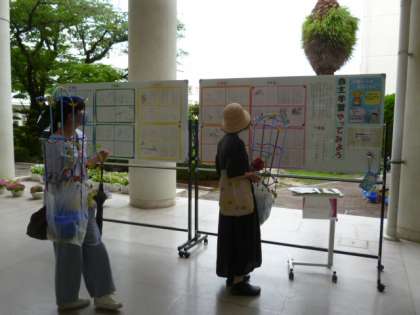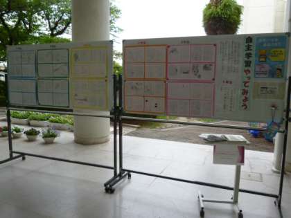 期末懇談会の期間中、ピロティで自学ノートの紹介をしています。