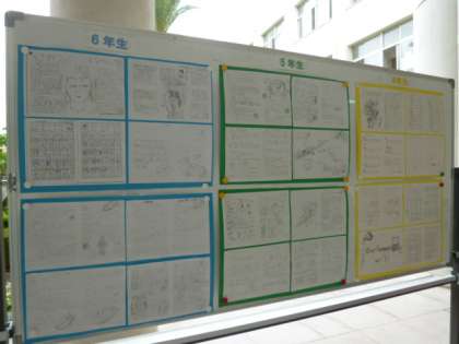 子どもたちは「これすごいなあ!」「こんなんやってみたい!」と言いながら、掲示に見入っていました。自分のノートが紹介されていた子は、「これ、ぼくのや」と、照れながらもとても喜んでいました。