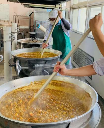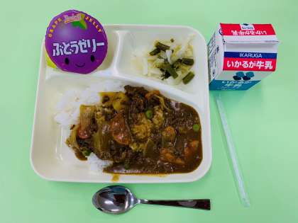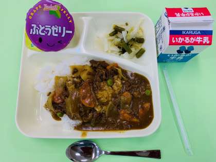 8、9、10月は、「食物アレルギー対応サポート月間」です。今日のビーフカレーライスも、通常は小麦粉が入ったカレールウを使用しているのですが、米粉のルウを使用しているため、小麦アレルギーの児童も食べることができます。ルウを入れた後は、よく煮込むことでとろみが増し、おいしいカレーができあがるので、調理員さんたちは暑さと戦いながら混ぜていました(右写真参照)。