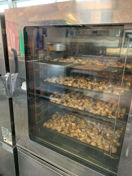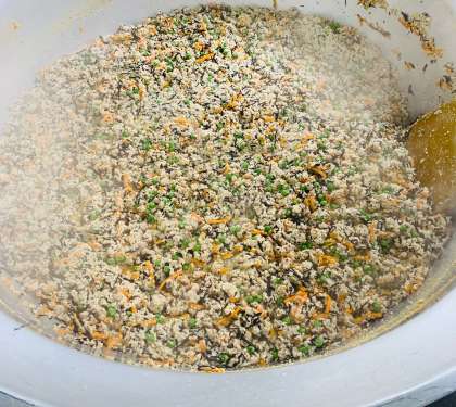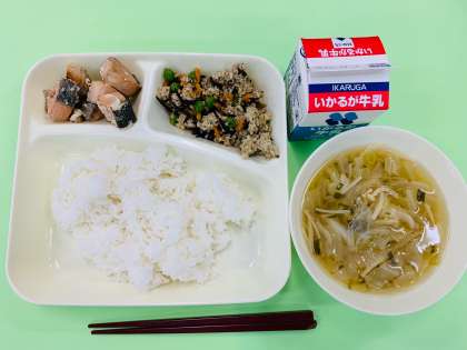高野どうふのいり煮は、粉末の高野どうふを使用しています。豚ひき肉をいためた中ににんじん、ひじき、だしを入れて煮、砂糖、塩、こい口しょうゆで味つけした後、グリンピースと粉末の高野どうふを一度に加えて煮ています。高野どうふは、カルシウムやマグネシウムが豊富な食品です。粉末なのでひき肉ともよくからみ、うまみがしみこみます。見ためでにがてな子どもも、食べてみると「おいしい!」と言っていましたよ。(右写真参照)