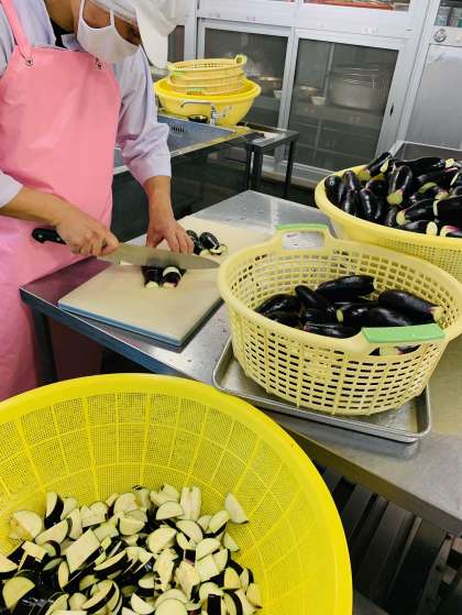なすは、一つひとつ調理員さんが包丁で切った後、一度ゆでて使用しています(右写真参照)。給食は大量調理なので、ゆでることでなすのアクが取れ、火の通りをよくしています。