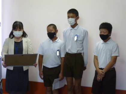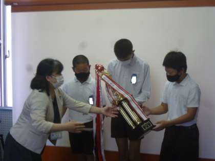 9月5日(日)に行われた大会で菅原のソフトボールクラブが優勝し、今日の児童朝会で、代表の児童に表彰状とトロフィー(とても立派です)を手渡しました。