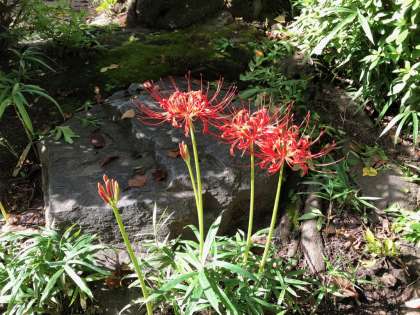 彼岸入りを目前に、中庭の池のほとりで、彼岸花が咲きました。