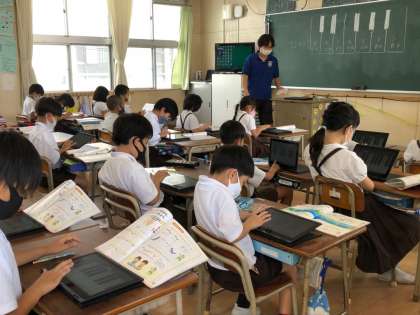 (写真下)2年生では、一人一台端末のアプリを用いて学習に取り組んでいました。