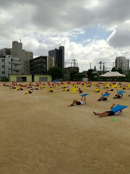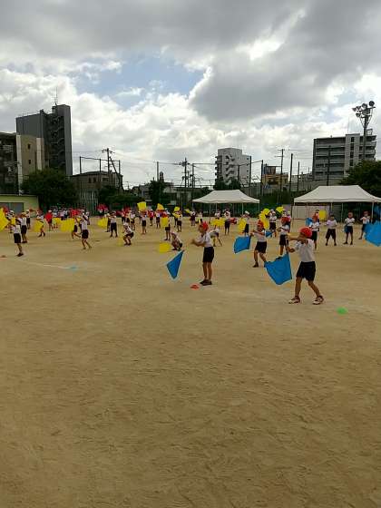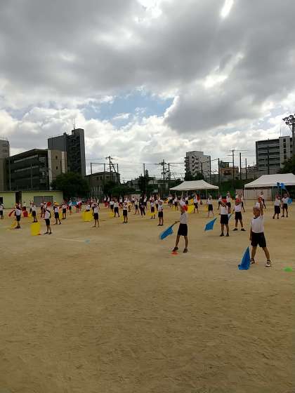 今日は、初めて団体演技の練習で運動場に出て練習をしました。講堂の時よりも大きく旗を振って演技をしていました。毎日練習が続くので、本番ではどんな演技になるのか楽しみです。