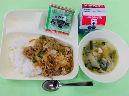 暑くて食欲がないときは、辛みのあるものを食べると、食欲を増進してくれます。給食の丼は、肉などのたんぱく質とともに、ビタミンたっぷりの野菜が入っているので、栄養満点です。