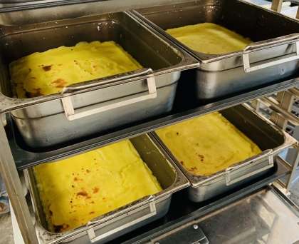 今日のスイートポテトは、旬のさつまいもがたくさん使われていました。徳島県産のなると金時を皮をむいて水でやわらかく煮、砂糖、バター、牛乳、クリームを入れて混ぜた後、ミニバットに入れて220度で10分間、焼いています(右写真参照)。