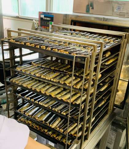 さんまは、年に一度の登場です。今日のみぞれかけは、骨つきのさんまに塩をして焼き物機で焼いた後、だいこんおろし、みりん、うす口しょうゆ、ゆず果汁を合わせて煮たたれをかけています。給食の焼き魚をつくるときは、右写真のように鉄板に網を敷き、油などがよく落ちるように調理しています。