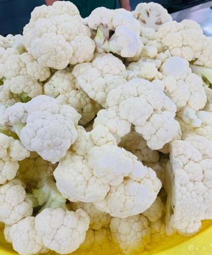 カリフラワー(右写真参照)は、今年度初登場の野菜でした。今日は、徳島県産のカリフラワーをコーンとともに蒸し、砂糖、塩、酢、油を合わせたドレッシングであえています。カリフラワーは、ブロッコリーと同じ花のつぼみを食べる野菜で、ビタミンCや鉄を多く摂ることができます。