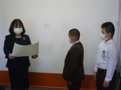 今日の児童朝会では、柔道大会でがんばった児童への表彰を行いました。