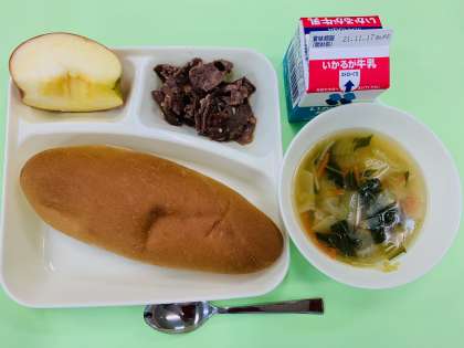 今日のりんごは、岩手県さんのものでした(右写真参照)。りんごにはいろいろな品種があり、前回は「サンふじ」でしたが、今日は「ジョナゴールド」でした。サンふじと違い柔らかく、前回のりんごと比べて食感の違いに気づいた子どももいましたよ!