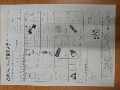 今日は「おやつについて考えよう」というめあてで、栄養の先生に授業をしていただきました。自分が普段何気なく食べていたお菓子やフルーツなどに、どのくらいカロリーがあるのかや、砂糖や油が使われているものはカロリーが高いということを学びました。