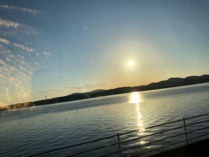 そろそろホテルに着きます。車窓から、川ごしの夕陽が綺麗です。