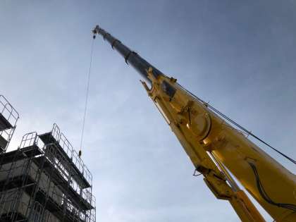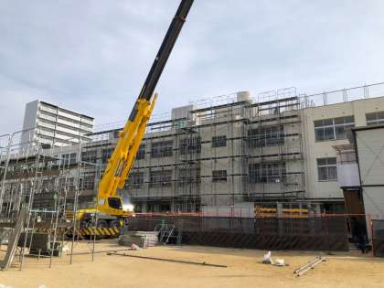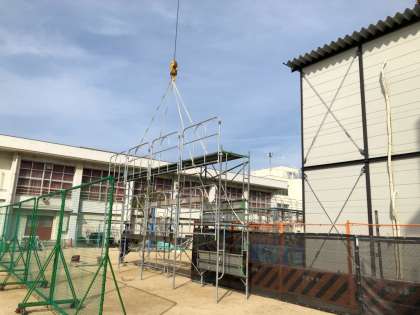 大量の足場材が、クレーンに吊り上げられ、組み立てられていきます。