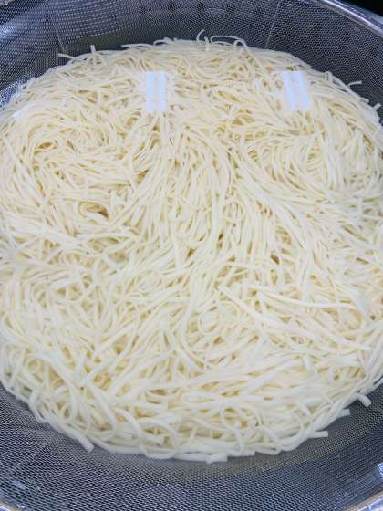 うどんは別の釜でかためにゆでた後、水にさらして(右写真参照)、味つけしたカレーの汁に入れています。ボリュームのあるメニューでしたが、子ども達には食べやすく、大人気でした。