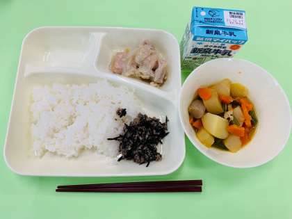 魚ひじきそぼは、初登場の「魚ミンチ」という食品を使った献立でした。魚ミンチは、すけそうだら100%をひき肉状にしたものです。今日は、油で魚ミンチをいためた後、ひじきを入れ、砂糖、みりん、うすくちしょうゆで味つけし、最後にしそを加えています。