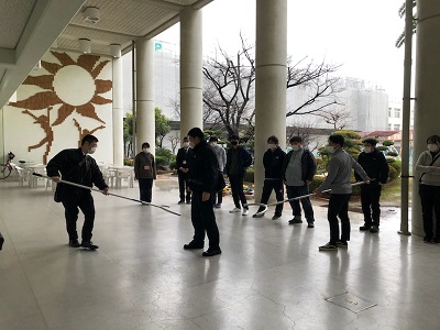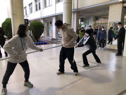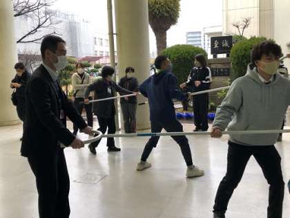 まずは、不審者が侵入したときの基本的な対応の方法を学び、その後、実際にさすまたを用いた訓練を行いました。さすまたをつかまれたときに、どうやって奪われないようにするかなど、経験することで実感することも多くありました。