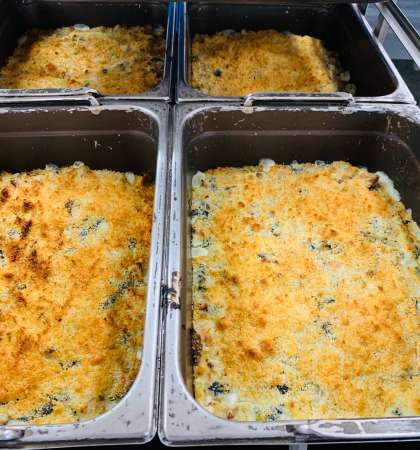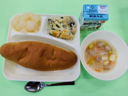 今日から3学期の給食が始まりました。初日は、大人気のグラタンでした。鶏肉やマカロニ、ほうれんそうなどをたっぷり入れ、焼き物機でこんがり焼いたボリュームのあるものでしたよ。(右写真参照)