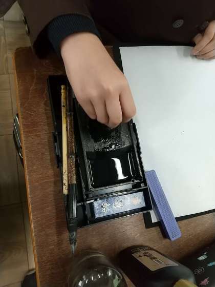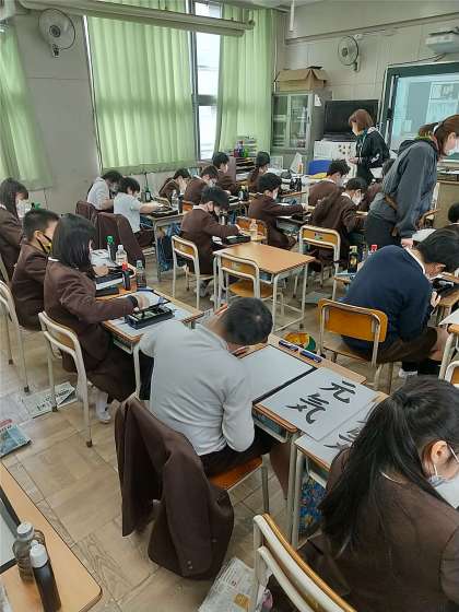 書写の時間では、墨汁を使わずに墨をすりました。書いてみると、濃い色や薄い色の人など様々でしたが、楽しそうに墨をすっていました。