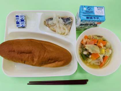 あじのレモンマリネは、下味をつけたあじを油で揚げた後、マリネ液(たまねぎをいため、砂糖や塩、酢、レモン汁などで味つけしたもの)をかけています。今日は、和歌山県産の生のレモンを給食室でしぼって、マリネ液に使っています。レモンは酢とくらべて、まろやかな酸味が特長です。(右写真参照)