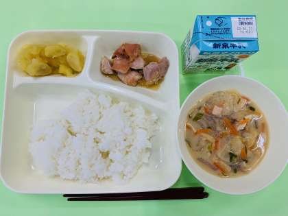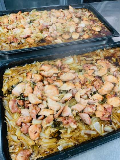 鶏肉の甘辛焼きは、鶏肉に料理酒、砂糖、みりん、こい口しょうゆで下味をつけた後、そこへたまねぎを加えて、焼き物機で焼いています(右写真参照)。ごはんが進み、人気の献立でした。