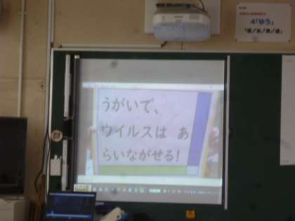 活動内容の発表では、健康委員会の代表児童から、ポスターや動画をつくって「正しい手あらいのしかた」をみんなにお知らせする取り組みについての報告がありました。