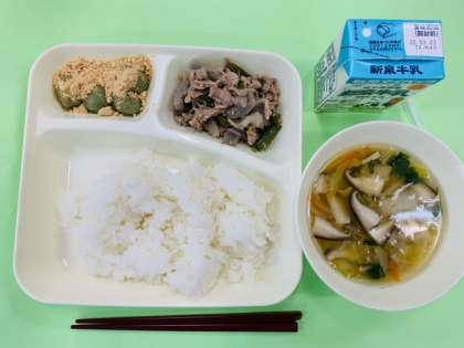 よもぎだんごは、春が旬のよもぎを練り込んだだんごをゆで、みつをからめています。食べるときに、1人一袋のきな粉をかけています。