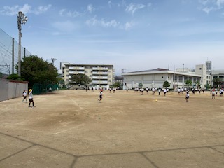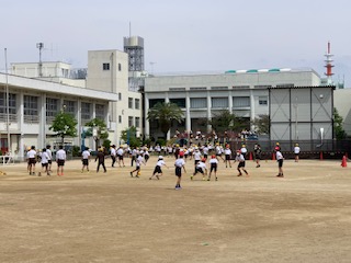 たくさんの子どもたちが運動場で元気に遊んでいます。