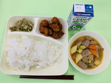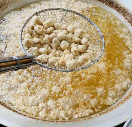 まぐろのオーロラ煮は、静岡県のキハダまぐろをしょうが汁、酒で下味をつけ、でんぷんをまぶして油で揚げています。(右写真参照)別の鍋でケチャップ、砂糖、赤みそを混ぜてたれをつくり、揚げたまぐろにからませています。魚を使った献立の中でも、人気のメニューです!