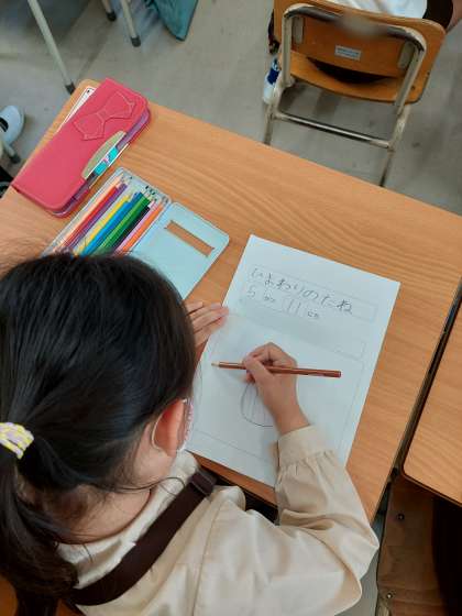 生活科の学習で、ひまわりの種の観察をしました。前にあさがおの種の観察をしたので、その種と比べて形が違うことや、模様がついていることなど、様々なことに気づいていました。