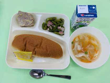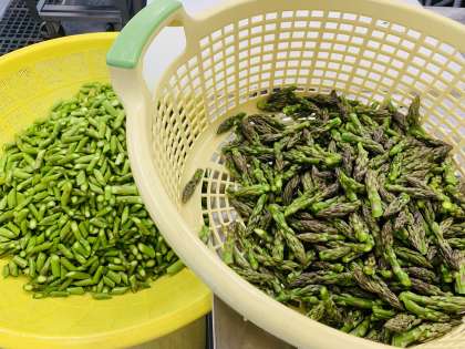 今日は、今が旬のグリーンアスパラガスが登場しました。給食調理員さんは、硬さがちがう穂先と根元を分けながら切り(右写真参照)、下ゆでするタイミングを変えるなど、工夫しています。柔らかくて、ベーコンとの相性がよいメニューでした。