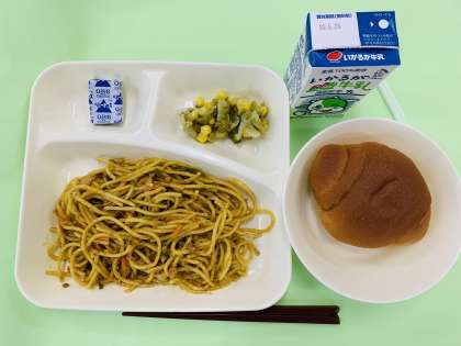 カレースパゲッティは、豚ひき肉やベーコン、たまねぎなどが入ったもので、カレールウの素やこい口しょうゆなどで味つけしています。