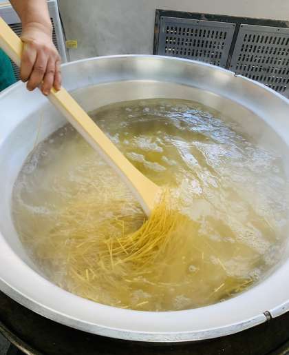 学校給食では、スパゲッティをゆでるのも量が多いので、釜でかためにゆでてから(右写真参照)、スパゲッティのソースと合わせています。子ども達に大人気のメニューでした。
