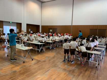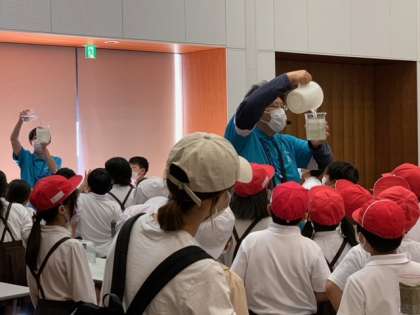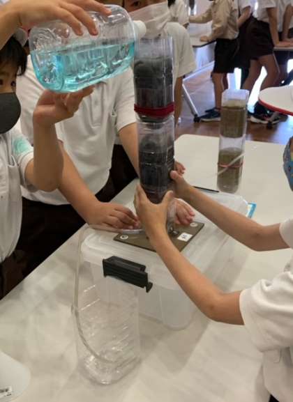 ゴミや匂いをとって、水がきれいになる工程を実験しました。