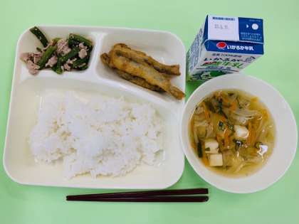 いわしてんぷらは、油で揚げた後、砂糖や酢、こい口しょうゆなどを合わせたタレをかけています。5月に登場したきびなごてんぷら同様、骨ごと食べられるので、カルシウムをたくさん摂ることができます。