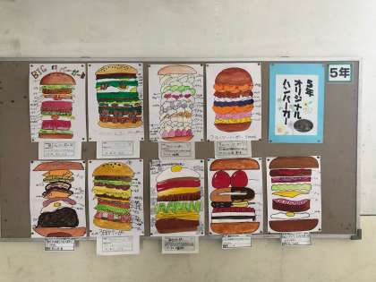 5年生は図工の絵画作品でオリジナルハンバーガーを描きました。面白いハンバーガーがたくさんあり、どのハンバーガーも美味しそうね描くことができました。