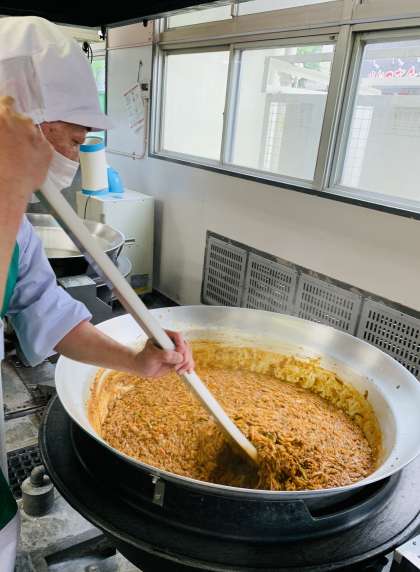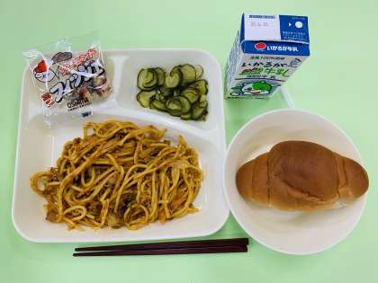 今日のスパゲッティは、牛・豚ひき肉やにんじん、たまねぎなどが入ったものでした。小麦粉と油をじっくり褐色になるまでいためたルウを入れることで、こくのあるソースになっています。子ども達に大人気のメニューでした。