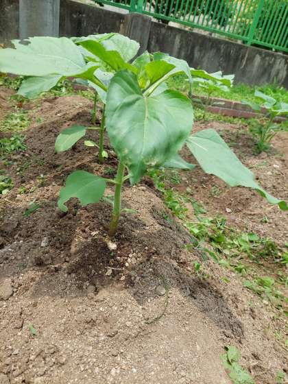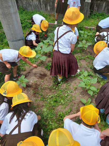 生活科の学習で、ひまわりの観察をしました。育てているあさがおと葉の大きさや、生え方、茎の太さなど、色々な違いがあることに気づいていました。その後、雑草を抜いて学習園を綺麗にしました。