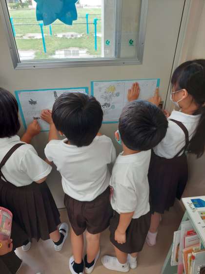 マンガ係の人たちの漫画が出来上がったので、それを見ている様子です。