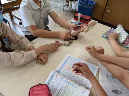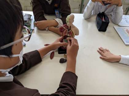 小さな人体模型を使って、それぞれの器官がどのような形で体内のどの位置にあるか学習しました。