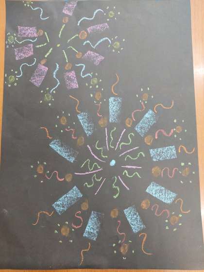 図画工作科の学習で、花火の絵を描いています。今まで学習した線の描き方や点、波線などの新しい描き方を組み合わせて花火をのデザインを考えました。来週、みんな仕上げて、観賞をする予定です。素敵な花火がたくさんできそうで、楽しみです♪