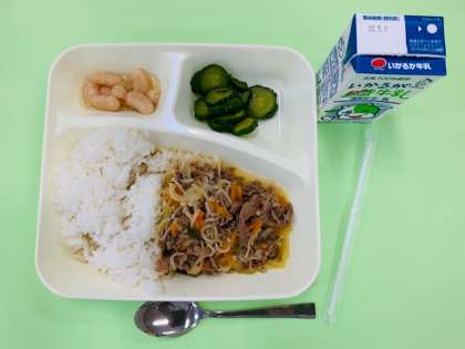 給食では、乾燥の大福豆を熱湯に30分浸してから、砂糖、塩、うす口しょうゆを加えて焼き物機で蒸し焼きにしています。