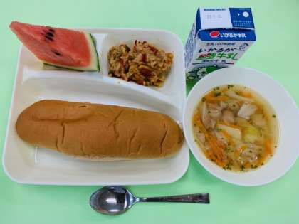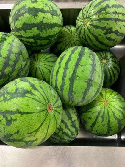 すいかは、年に一度の登場です。今日は、鳥取県から12玉のりっぱなすいかが届きました。給食室では、これを64人分に切り分けます。