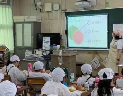 すいかのどこが甘いのか、どうやって切り分けているのかを、各クラスで見てもらいました。